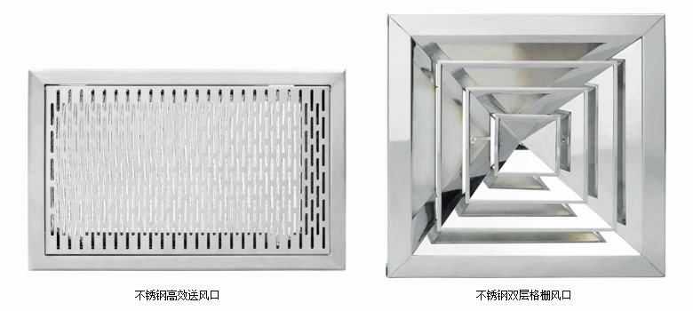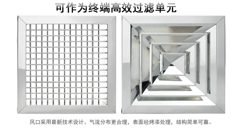 風口采用最新技術設計、使氣流分布更合理,箱體采用優質不銹鋼板或冷軋鋼板制作,表面經烤漆處理,結構簡單可靠,其中高效送風口可作為終端高效過濾單元直接置干各個級別的潔凈率吊頂等。